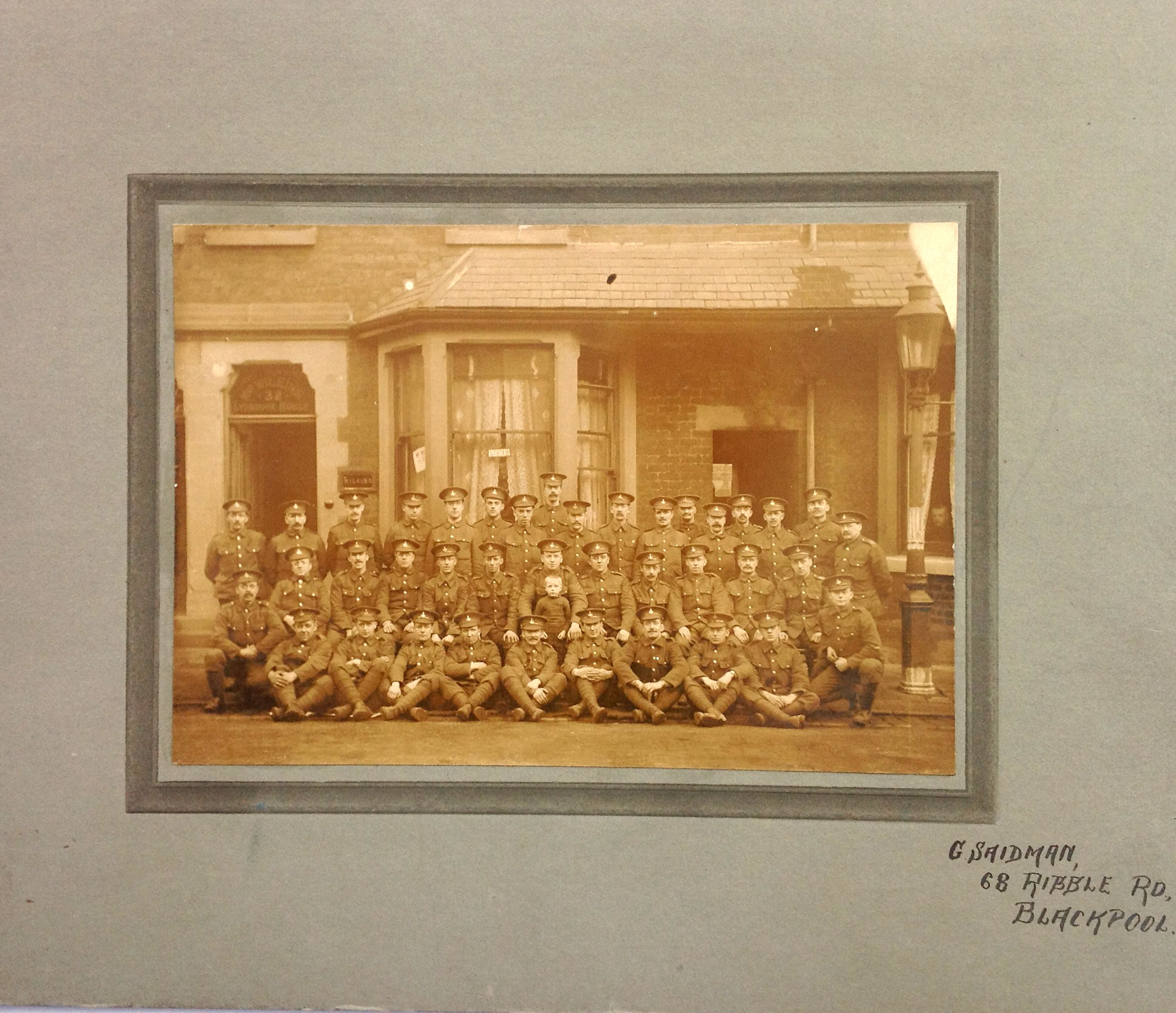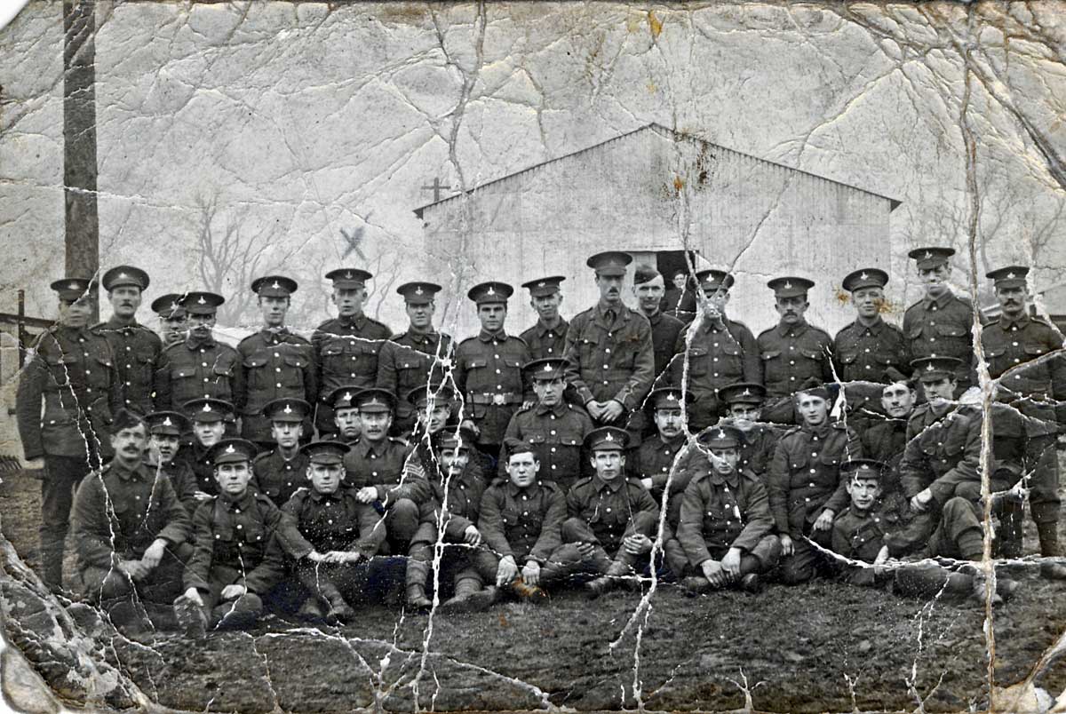 the War in 1914. The group of soldiers was photographed outside the