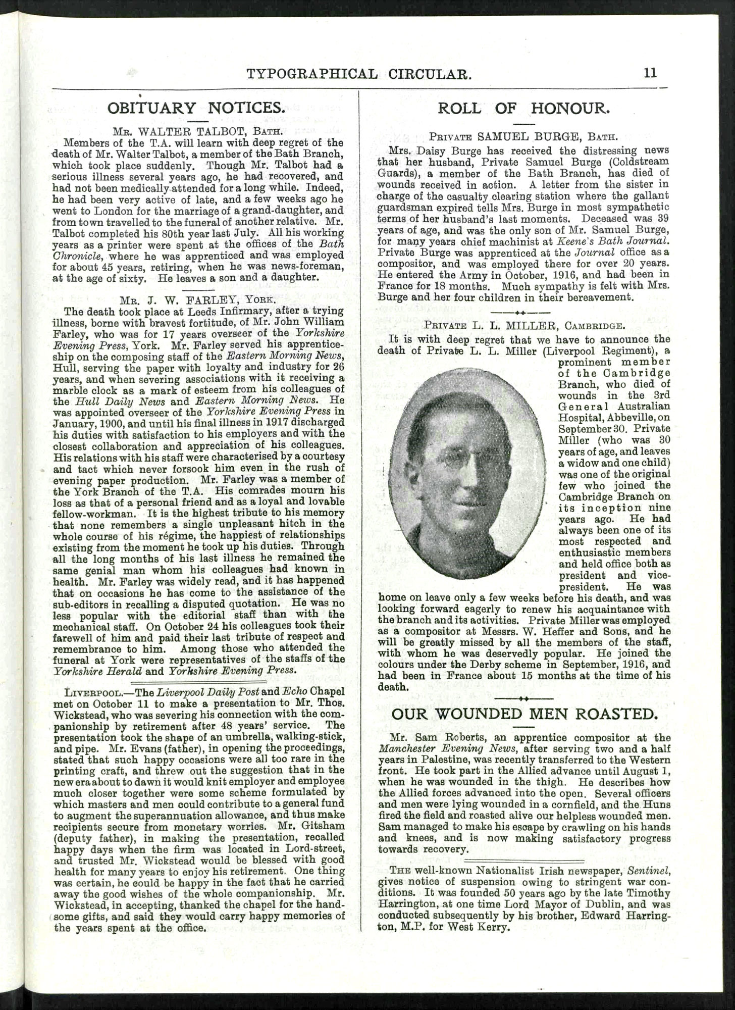 The above photo was provided by Chris Weekes (<weebex12@hotmail.com>), who has also provided a copy of an obituary for Leonard Miller from a Trade Union journal from October 1918. Leonard Miller worked as a compositor for a Cambridge printing press, and was a Trade Union member.