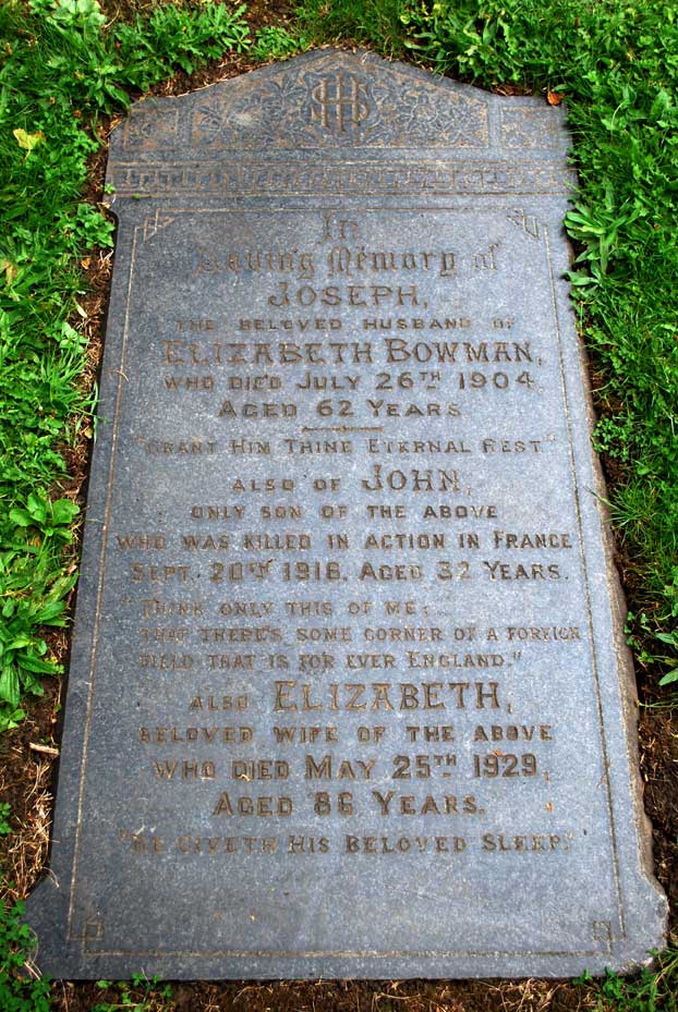 There are also several monumental inscriptions, for soldiers remembered on the memorials or headstones of their families. Select the link below to see these memorials or headstones. Ray Wilkins (<e2ray3636@ntlworld.com>) has photographed these headstones which commemorate soldiers of the Yorkshire Regiment.