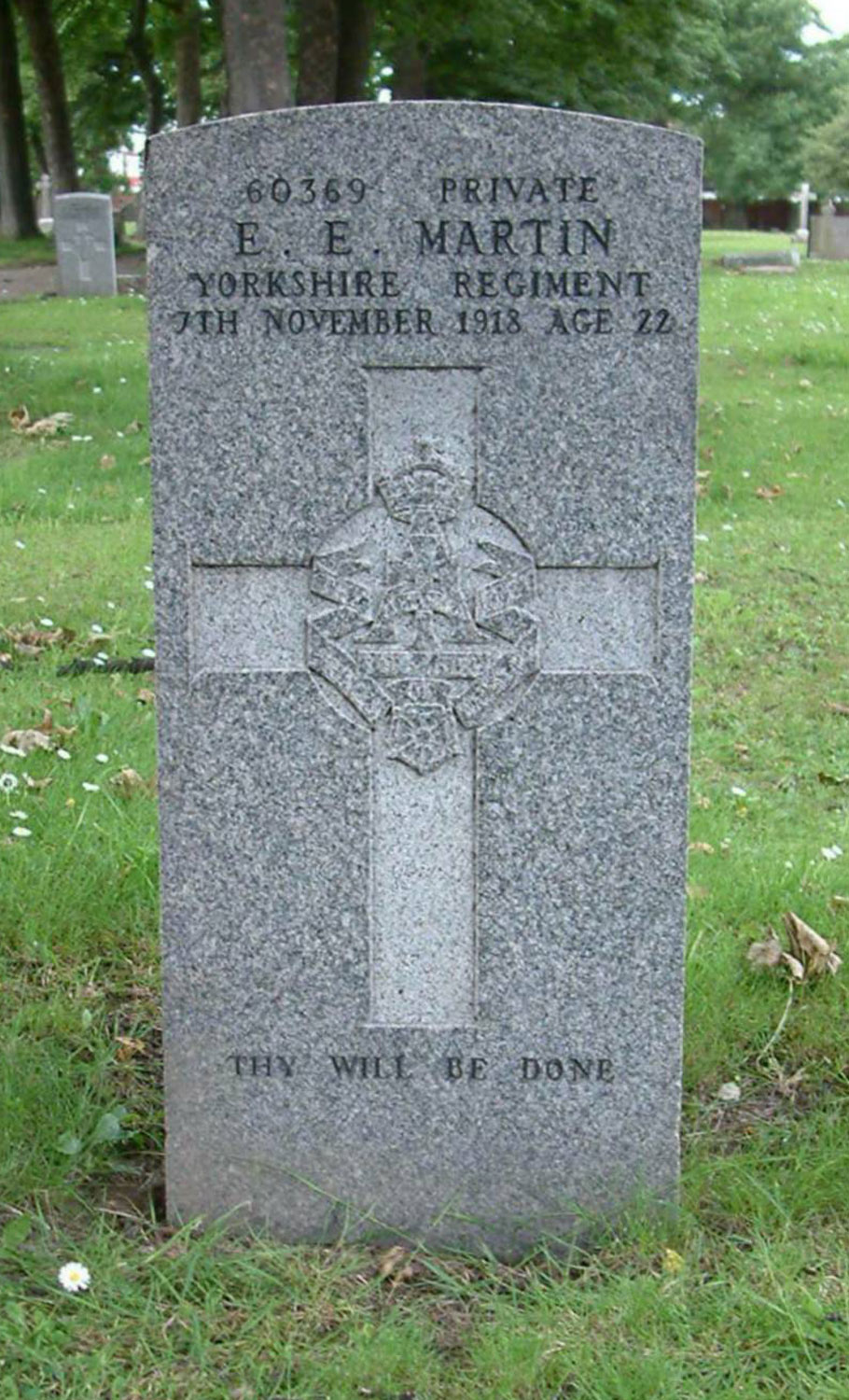 | Private Ernest Edward Martin. 60269. 9th Battalion Yorkshire Regiment. Son of Mr. J. T. and Mrs. M. A. Martin, of 36, Stovin St., North Ormesby. Died 7 November 1918. Aged 22. Born Middlesbrough, Enlisted Middlesbrough, Resided North Ormesby. "THY WILL BE DONE"