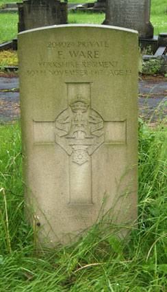 | Private Frank Ware. 204024. 4th Battalion the Yorkshire Regiment. Son of Thomas Ware, of 2, Middlecave Rd., Malton. Died at home 30 November 1917. Aged 19. Born Malton, Enlisted Malton "THE LORD BE WITH YOU TILL WE MEET AGAIN" Photo : Norman Cummings (<norman_cummings@hotmail.co.uk>) For a larger sized image of the headstone which opens in a new window, select the image on the left. |