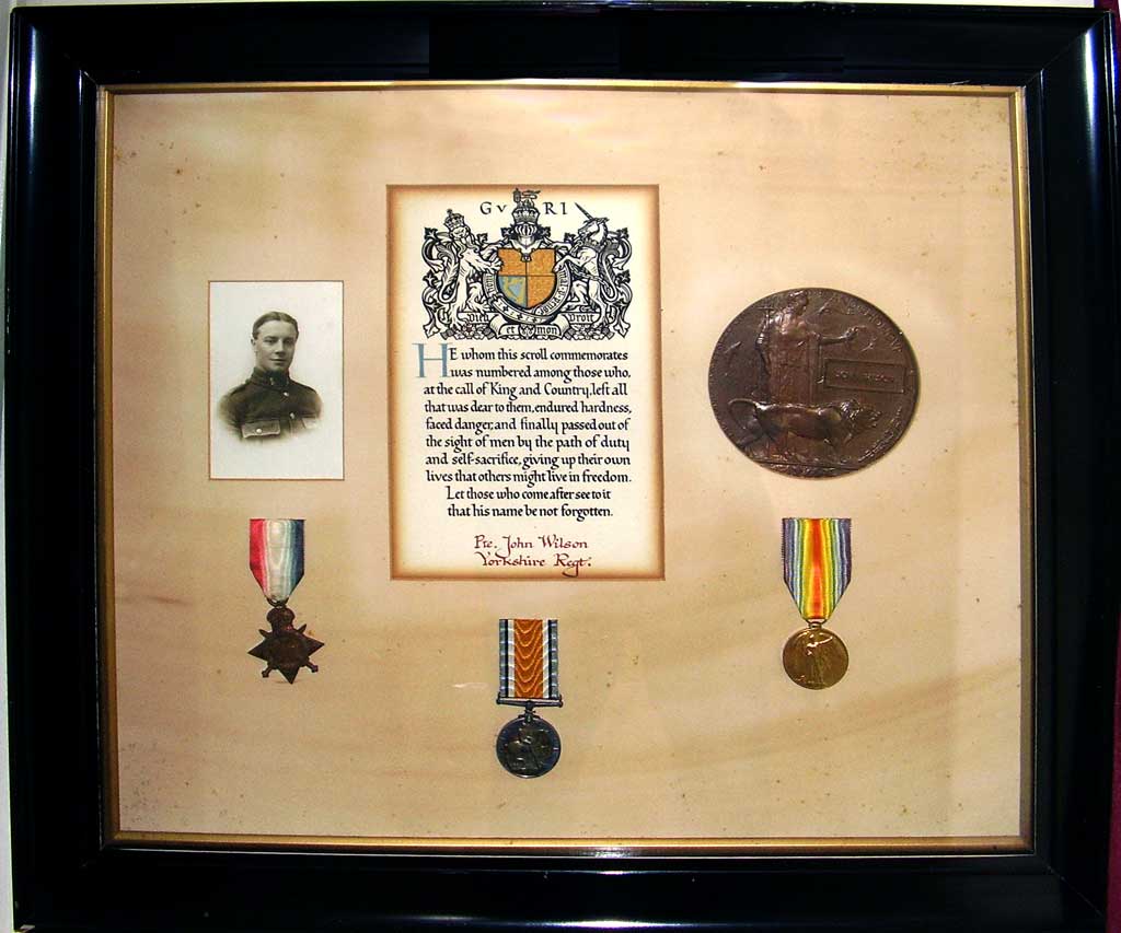 Dennis Wilson, <goldwolf82@hotmail.com> has kindly provided a photograph of the Memorial Scroll, Memorial Plaque, and World War 1 campaign medals for his uncle, Private John Wilson of the 2nd Battalion the Yorkshire Regiment. These items are mounted in a frame, together with a photo of John Wilson, and are in the possession of the Wilson family. As this forms a unique family memorial, it was felt that it was worth showing these items on a special page on this website with descriptions for each item.